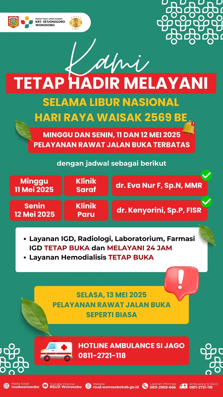 Berdasar Surat Edaran Direktur No. 445/IV/2025/RSUD tentang Pemberitahuan Pelayanan pada Libur Nasional dan Cuti Bersama Tahun 2025 bahwa untuk memastikan layanan optimal dan kelancaran pelayanan publik di RSUD KRT. Setjonegoro maka diberitahukan