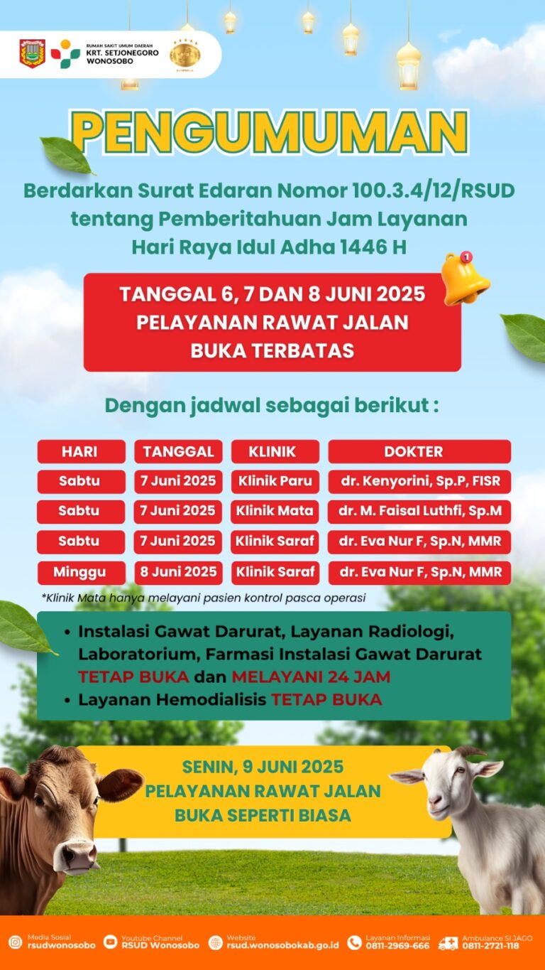 Berdarkan Surat Edaran Direktur RSUD KRT. Setjonegoro Wonosobo Nomor 100.3.4/12/RSUD tentang Pemberitahuan Jam Layanan Hari Raya Idul Adha 1446 H diberitahukan bahwa :