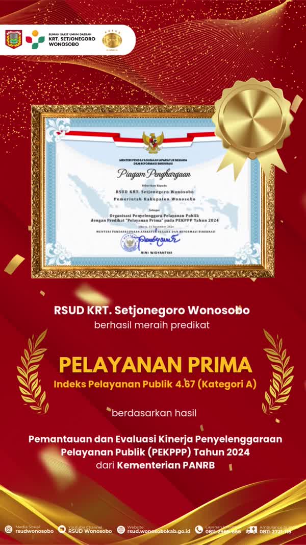 Prestasi ini menjadi wujud nyata, RSUD KRT. Setjonegoro Wonosobo memberikan pelayanan yang prima dan paripurna kepada maysrakat. Terima kasih atas dukungan dan kerja bersama seluruh pihak terkait dan masyarakat Wonosobo. Bersama, kita wujudkan tata kelola Rumah Sakit yang terunggul, bermutu dan terpercaya