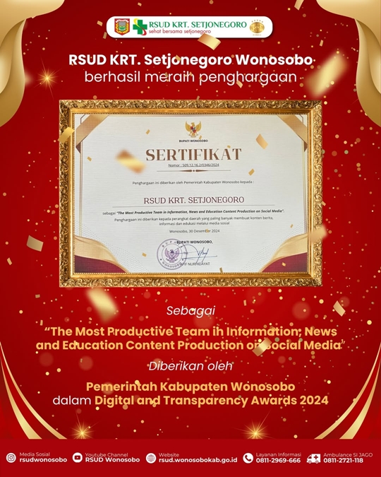Dipenghujung tahun 2024, RSUD KRT. Setjonegoro Wonosobo meraih penghargaan sebagai “The Most Productive Team in Information, News and Education Content Production on Social Media” yang diberikan oleh Pemerintah Kabupaten Wonosobo dalam Digital and Transparency Awards 2024 yang diselenggarakan oleh Dinas Komunikasi dan Informatika Kabupaten Wonosobo bertempat di Gedung Korpri, Senin 30 Desember 2024. Penghargaan ini diberikan kepada perangkat daerah yang paling banyak membuat konten berita, informasi dan edukasi melalui media sosial.