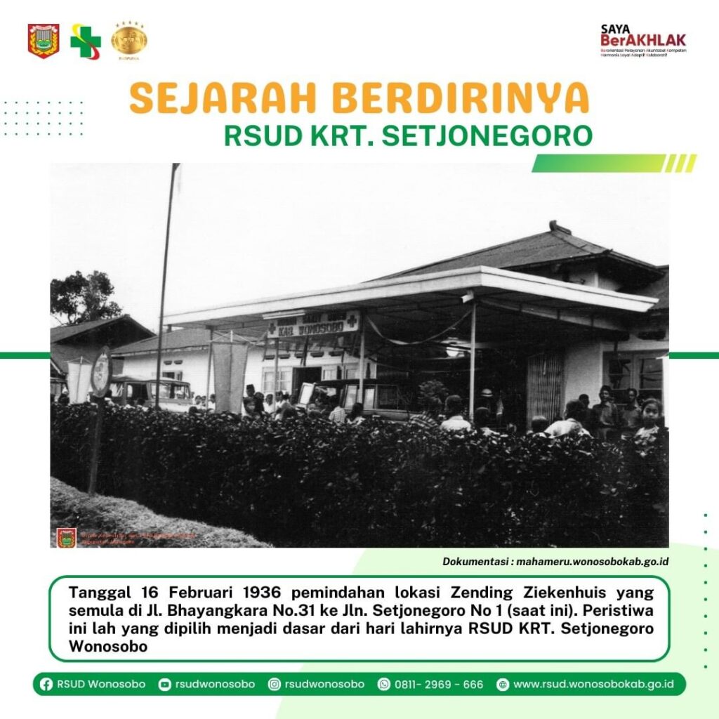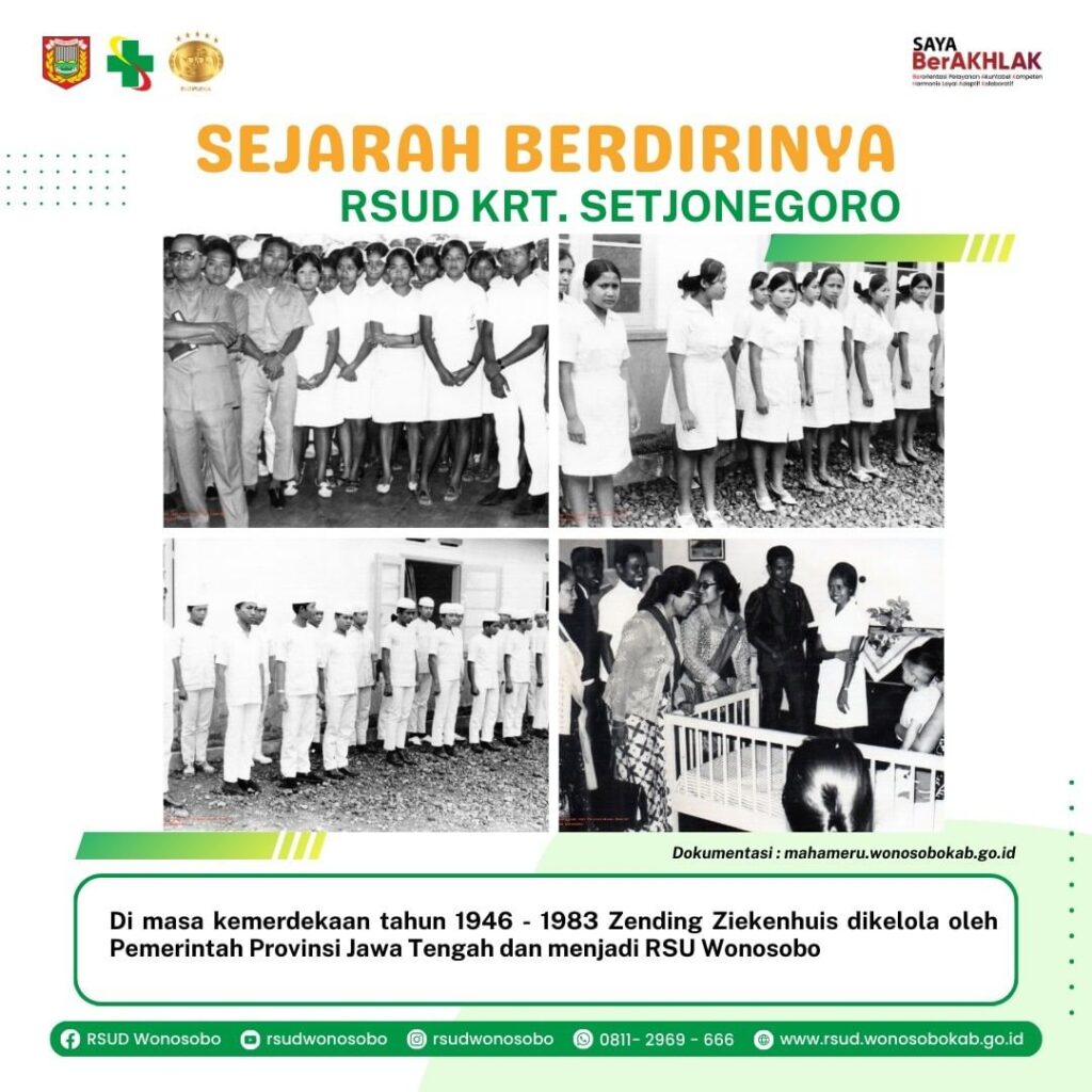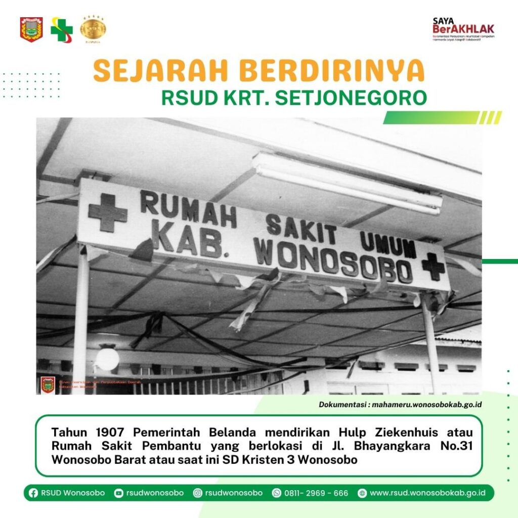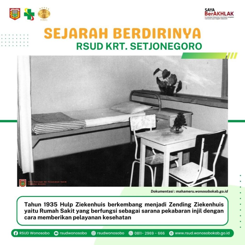 Pada Tahun 1907 Belanda mendirikan semacam Rumah Sakit Pembantu yang diberi nama Hulpziekenhuis. Seiring berjalanya waktu Hulpziekenhuis berkembang dan dibuka kembali dengan nama Zending Zienken Huis pada Tahun 1935. Pada tahun 1936 tepatnya pada tanggal 16 Februari, Zending Zienken Huis dipindahkan dari lokasi lama (yang sekarang SD Kristen) ke lokasi baru dimana saat ini RSUD KRT. Setjonegoro berdiri.