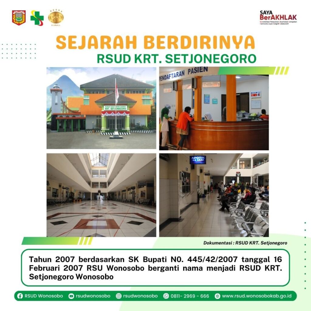 Dengan Peraturan Daerah nomor 13 tahun 2000 RSUD Wonosobo ditetapkan sebagai RSUD Unit Swadana dan selanjutnya ditetapkan sebagai Badan Rumah Sakit Daerah berdasarkan Peraturan Daerah No 26 tahun 2001. Pemberian nama RSUD KRT. SETJONEGORO dikukuhkan dengan SK Bupati no. 445/42/2007 tanggal 16 Pebruari 2007. Nama KRT. Setjonegoro diangkat dari nama Bupati Pertama Kabupaten Wonosobo. Pada Tahun 2022 RSUD KRT. Setjonegoro juga telah kembali lolos akreditasi dengan predikat Paripurna.